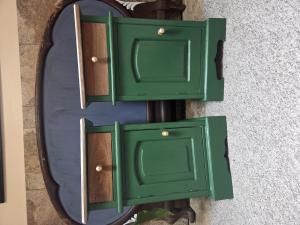 Description: Really cute pair of all hard wood farm green side tables. All surfaces have been sealed for protection.The back sides are also painted so they can be displayed. Would look great in a living room as end tables, bedroom as nightstands, or in an office space as side tables.Measurements: H 26, D 15, W 15 1/2 inches