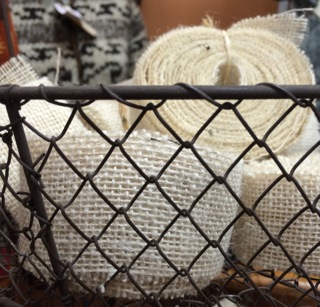 Dealer #16 has ivory burlap bundles nesting in a great black wire basket.