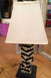 Stacked black and white wood squares form an architectural base for this lamp from Stars Too.