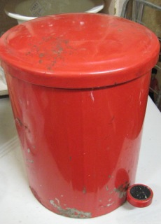 Vintage red waste receptacle with foot pedal from Dealer #74 helps clear out the old as we transition into 2015!