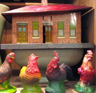 The new year brings with it an opportunity to take a second look at our home and belongings. Wants, must-haves, and needs! Vignette of tin house and ceramic hens at Stars Too.