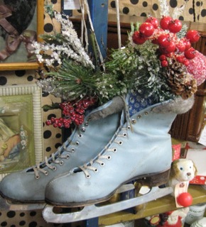 A lovely pair of sky blue ice skates filled with holly and evergreen sprigs are a warm welcome as company arrives. Available from Dealer #61.
