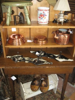 Dealer #35 shows copper kettles and molds with wooden shoes. Feeling like cozying up to the fire with a book? Follow us through the stores as we hunt and gather for Fall and family activities as the sun sets earlier.