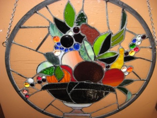 To close out the harvest season, hang this colorful vase of fruit in the kitchen window for a play of color and dancing light. From Dealer #8, this stained glass hanging keeps the harvest alive through even the cold of winter.