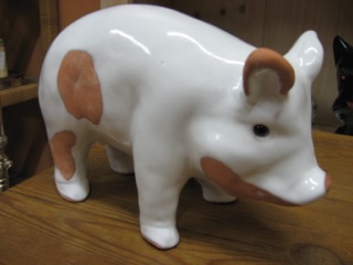 This little piggy was found nesting in the upper shelves in a dapper outfit. All dressed up and waiting to go home with you! If you can't have the real thing, this porcelain piglet will still make you happy to come through the door after a long day at work! Available from Dealer #37, the Shawnee collectible also serves for your secret stash of cookies and treats.