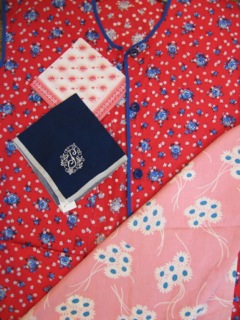 Dealer #44 has a selection of hankies, aprons, and smocks in a variety of red, white, and blue prints.