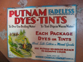 That's right, Putnam Dyes, introduced in the late 1800's, had instructions and images for "tied dye" in the 1930's manual. Dealer # 63 has this brilliantly colored tin cover from a display cabinet hanging in his space.