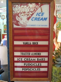 Stars Too has this wonderful Borden's Ice Cream board hanging from a cabinet. The trick is to really read the selections...the clerk pointed out the unusual spellings at the bottom that add a whole new level of charm and humor to this collectible.