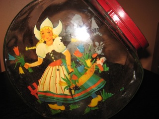 While the tulips are just breaking ground, you can have this colorful vintage storage jar. A cheerful red lid and different stencils on each side forecast the arrival of the tulip festival from Dealer #86. What you store inside is limitless!