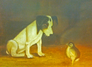 Put a puppy in a picture and you have instant suckers. The draw of an animal in a painting seems to be universal, especially dogs and cats. We are dog people (sorry cat folks) so this painting in Dealer 54's wall space stopped us in our tracks. She has this priced at $125. And that is a good price for a painting of a door much less a puppy and a birdie.