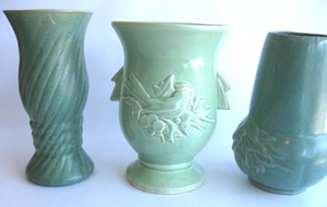 Green is the pc word of the moment. But we are talking about another green. Green pottery. We love it!!! And Dealer 40 has some choice pieces in her space at Stars. The plain green vase is $24 and the McCoy pots are $69 and $89. So green and so lovely. We can never have enough of green pottery