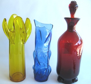Think mid-century and we think Blenko glass. Dealer 88 has a wonderful collection of all shapes and sizes. We picked out three of the batch. The yellow vase is $125, the blue vase is $75 and the red decanter is $149