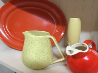 Dealer #74 places vintage pitchers alongside Bauer and other collectible bowls and plates.