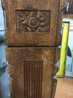 An old newell post with floral detail, bulls eyes, and scribed sides lends interest as an architectural piece from Dealer #1.