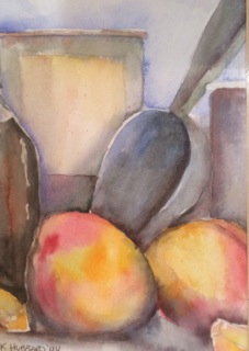 Vintage watercolor shows the loving preparation of fresh fruit. Available from Dealer #60.