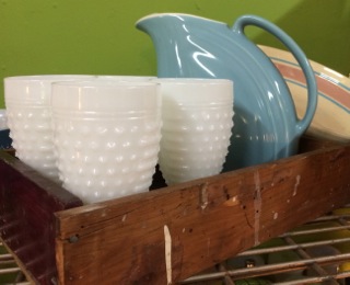 Classic milk glass and McCoy are served up in a divided wooden tray from Dealer #19.
